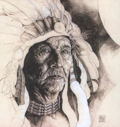 Perché proprio gli Indiani? "Perché, fuori di ogni retorica, gli Indiani d´America sono il popolo che più di ogni altro rappresenta la perfetta armonia tra uomo, natura e animali". Un legame che emerge nella bella tavola in cui lo sguardo lontano di un viso segnato dal tempo, è accostato agli occhi di un´aquila le cui ali si confondono con le piume del copricapo indiano.