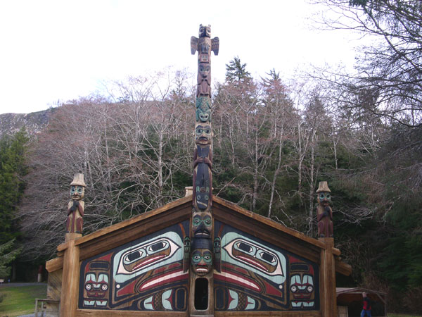 Agli angoli della casa siedono due figure maschili con cappelli conici, che avevano l'incombenza di deviare la pioggia in una zona voluta, in cui effettivamente cade in ragione di 4064 mm all'anno. Al centro, all'ingresso della casa tribale si erge il Totem del Corvo, il più potente di tutte le creature, il leggendario Creatore.