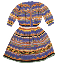 Nell’applicazione, strisce di stoffa stampata vengono cucite direttamente sull’indumento. Nel patchwork, la stoffa disegnata viene inizialmente ridotta in striscioline, poi cucite una dietro l’altra in un lungo nastro, oppure una davanti all’altra in una lunga banda. Questa tecnica consente di ottenere i più sorprendenti giochi compositivi, legati alla fantasia di chi esegue il lavoro. Nastri e bande sono poi cuciti insieme per ottenere un’unica pezza, pronta per essere tagliata secondo i modelli. Il prodotto finale è un abito patchwork molto colorato, con numerosi, complessi motivi distinti.